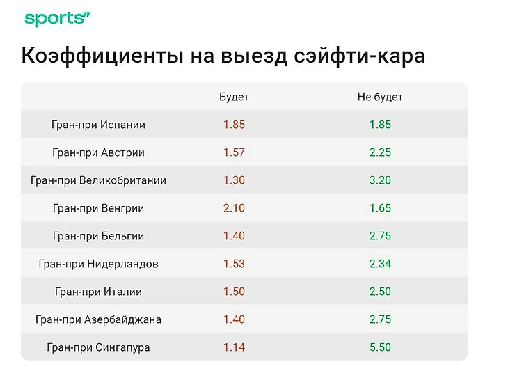 Средний коэффициент у букмекеров редко превышает 1.60 (62%) на появление сэйфти-кара, даже если трасса является относительно скучной и безопасной.