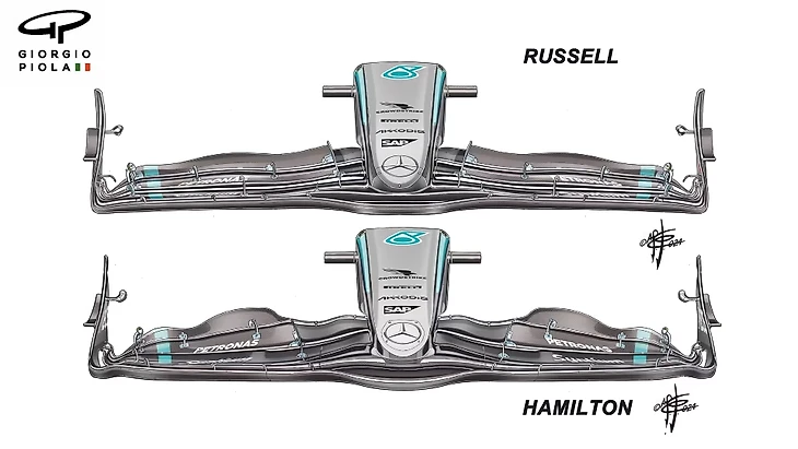 Среди целого ряда обновлений, включавших изменение внутренней части днища для увеличения объема потока в туннеле граунд-эффекта, «Мерседес» полностью изменил философию переднего крыла.
