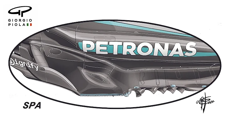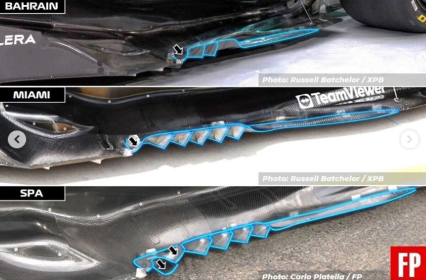 Помимо выреза в боковой стойке и выреза в «бутылке от кока-колы», команда подготовила абсолютно новое днище. Верхнюю часть опустили спереди, а лопасти впускного канала изменили так, чтобы использовать эффект от этого, а также от центральной секции «каноэ» новой формы между туннелями и новой геометрии диффузора.