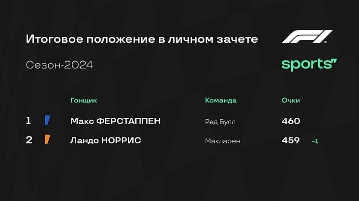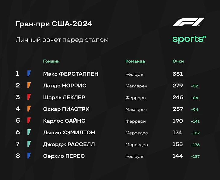 Впереди шесть больших гонок и три спринта (за стандартный этап можно заработать 26 баллов, за уик-энд со спринтом – 34, всего осталось разыграть 180 очков). Ферстаппен заработал 331 балл, Норрис – 279.