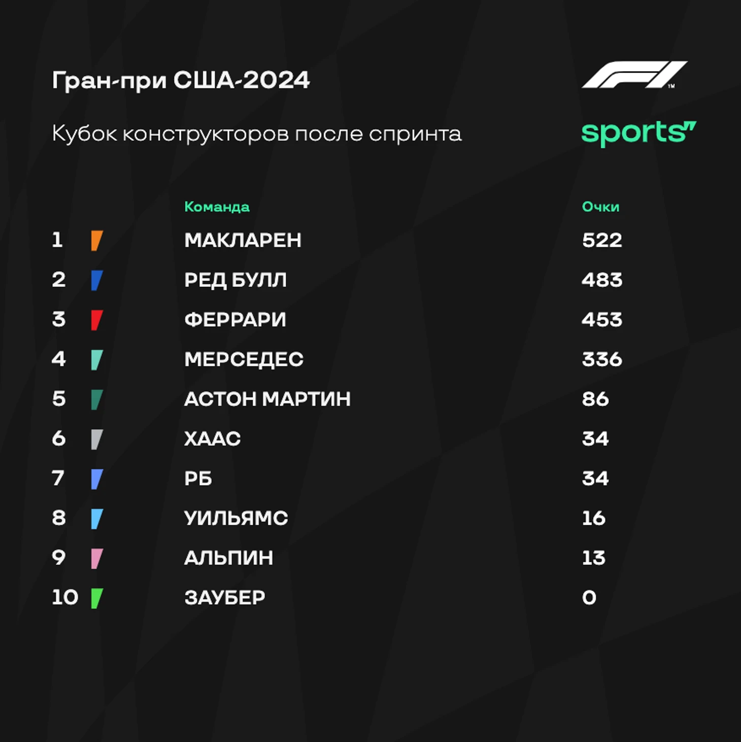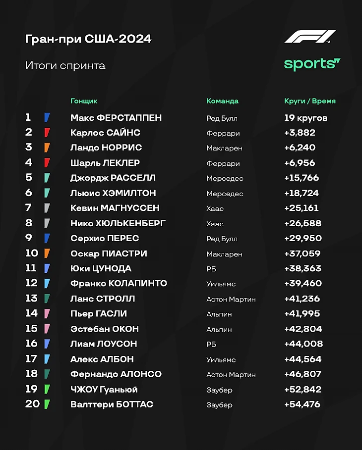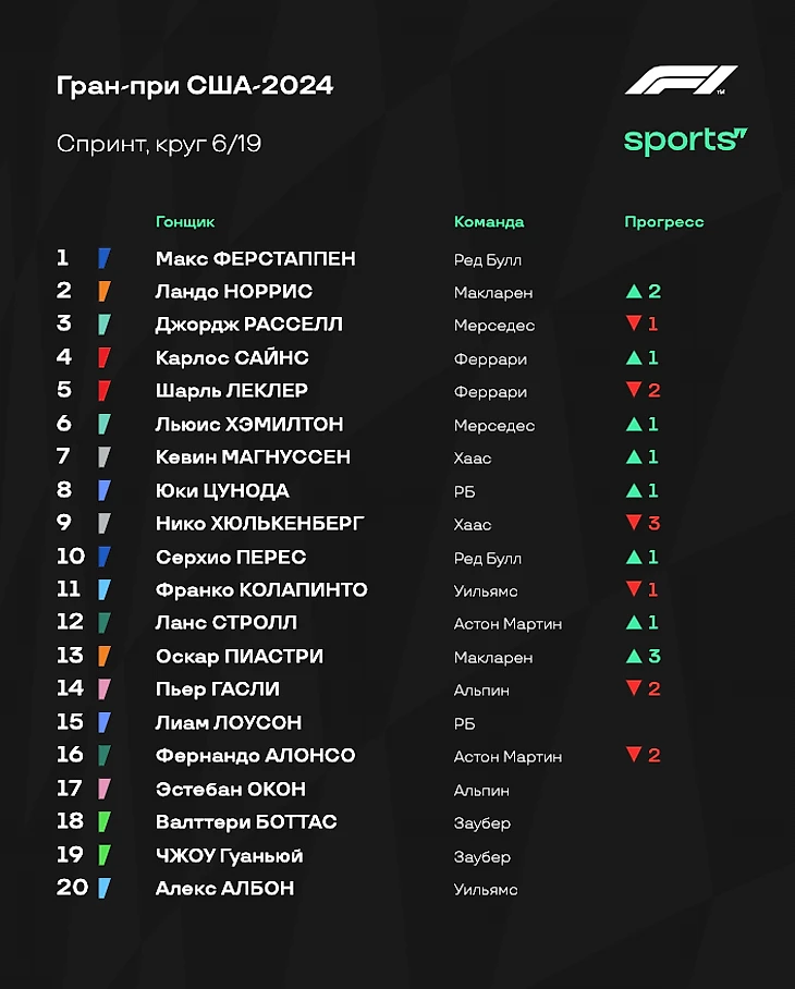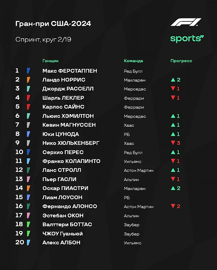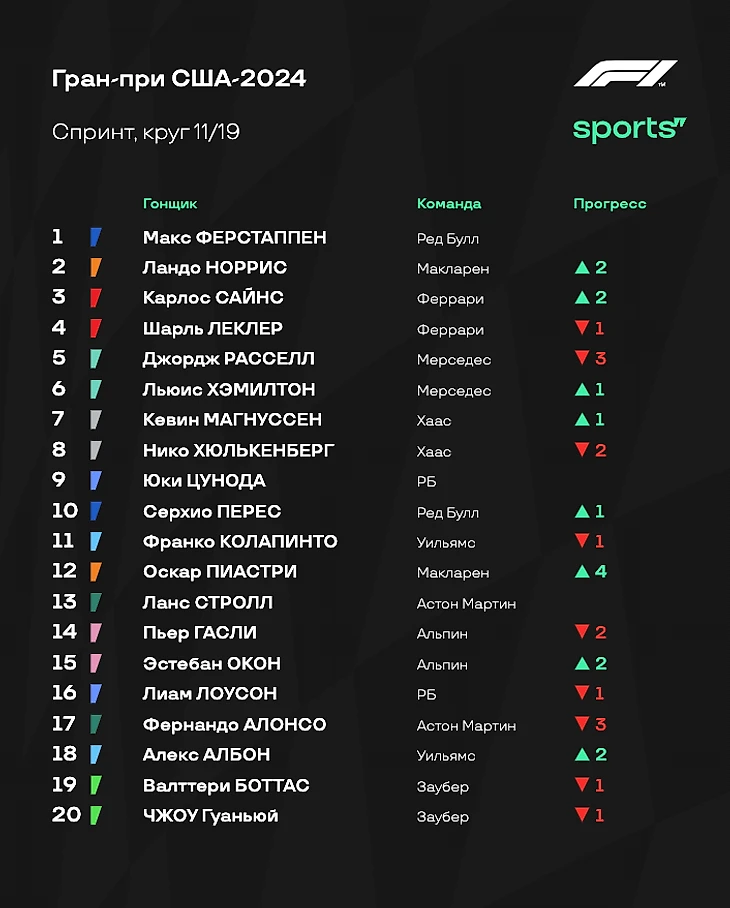 - Ферстаппен провел отличную гонку: Макс контролировал шины, контролировал темп. Без просчетов и серьезных ошибок. Все в лучших традициях прошлого сезона (хотя сегодня обошлось без безумного отрыва). Есть ощущение, что «Ред Булл» разобрался с проблемами болида, однако пока утверждать подобное не стоит. Дождемся основных сессий. - «Феррари» в гоночных условиях работает превосходно. Оба пилота еще до спринта предупреждали о том, что на длинной дистанции их машина справляется лучше. Сегодня мы увидели тому доказательства. Скудерия разобралась с «Мерседесом», а под конец смогла надавить на Ландо Норриса и вынудить его совершить ошибку. - Ландо ехал хорошо. Даже старт получился успешным - что удивительно. Норрис с каждым разом все лучше справляется. Но психологическое давление до сих пор остается его главной слабостью. Казалось, что пилот «Макларена» держал шины под контролем, но в итоге все-таки перестарался, износил резину и даже заблокировал ее. В этом плане ему еще предстоит работать над собой. - «Мерседесу» нужно разобраться со своим темпом. Вероятно, мощная скорость во вчерашней спринт-квалификации обусловлена агрессивным пилотажем - в результате которого шины были полностью изношены. В гонке такой подход не сработает. Подождем комментариев от пилотов. - Позади интересно было наблюдать разве что за прорывом Пиастри и борьбой Цуноды. Но оно и логично: середняки и аутсайдеры не особо любят рисковать в спринте. На очки им обычно рассчитывать не приходится, а заниматься борьбой за ненужные позиции никто не собирается. Вот и остается просто заниматься сбором данных. Тем не менее спринт вышел весьма боевым. Дальше интереснее: с новыми данными команды могут поменять настройки и покопаться в болидах. Результаты их работы увидим уже через три часа - во время квалификации к основной гонке. Она начнется в 01:00 по московскому времени - мы будем освещать ее здесь же. Не пропустите!