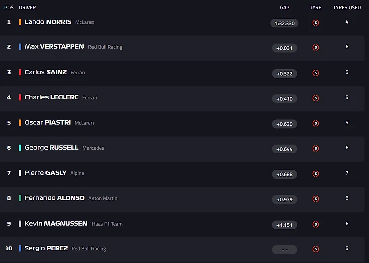 Ферстаппен - второй, до Норриса 0,031 секунды.