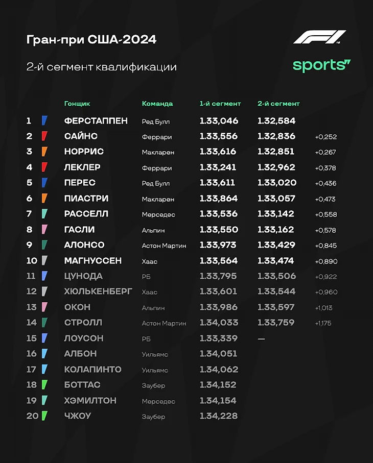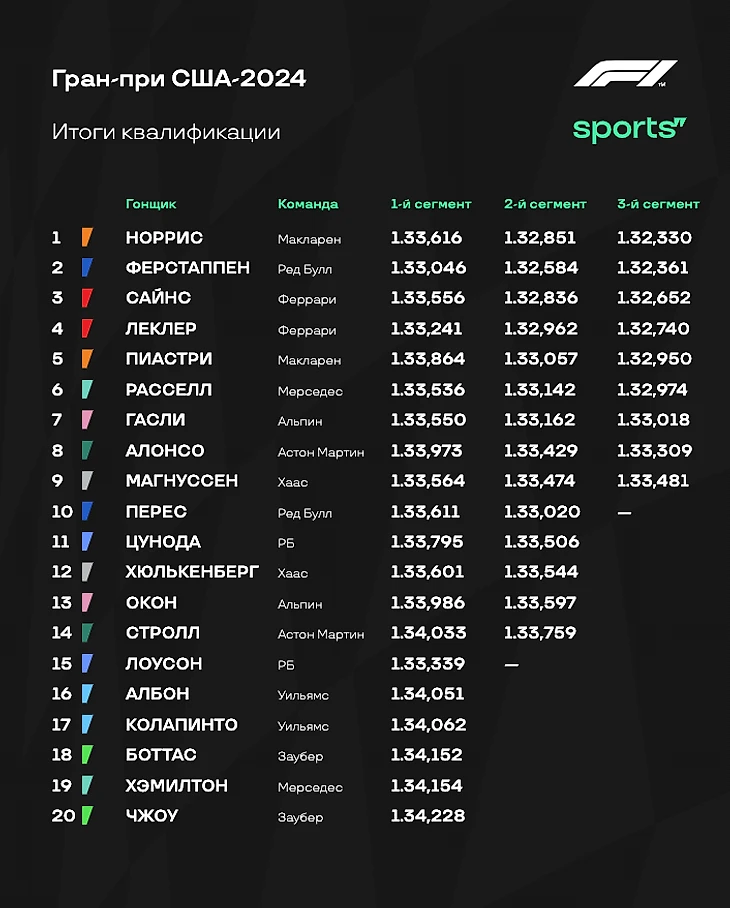 - Многое испортила авария Джорджа Расселла. Макс Ферстаппен шел с улучшением - быстрее Ландо Норриса, в то время как сам британец ехал медленнее самого себя. Поул, скорее всего, ушел бы к пилоту «Ред Булл», но... Случилось, что случилось. В комментариях после сессии Макс сказал, что доволен тем, что хотя бы у болида есть хороший темп и потенциал. - «Феррари» выглядит здорово. Скудерия внесла неплохие изменения в болид - и они дали хороший результат. Сайнс стартует третьим, а Леклер - четвертым. - Кошмарное выступление «Мерседеса». Расселл и без аварии выглядел сомнительно. У Джорджа был слабый темп (даже не на уровне топ-5), а Хэмилтон уже традиционно провалил субботу. Изменения в настройках в очередной раз убили сессию Льюиса. - Отметим хорошее выступление «Хааса». Обновления американцев явно работают. Они могли оказаться в третьем сегменте сразу двумя болидами - но помешала ошибка Нико Хюлькеберга. В любом случае темп у «Хааса», судя по всему, есть. - Пьер Гасли - седьмой? Пожалуй, одна из главных сенсаций квалификации в США. Очень неожиданный результат от «Альпин», хотя весь уик-энд они выглядели невзрачно (внимание привлекала разве что рекламная ливрея, напоминающая «Макларен»). Что это, удачная смена настроек? Подождем, что скажут в команде. Квалификация получилась как будто бы и интересной, но финал в виде аварии Расселла оставил невероятно неприятное послевкусие. Грандиозный финиш был испорчен. Будем надеяться, что завтрашняя гонка сполна компенсирует сегодняшнее разочарование. Не пропустите онлайн Гран-при США на «Спортсе» в 22:00 по мск!