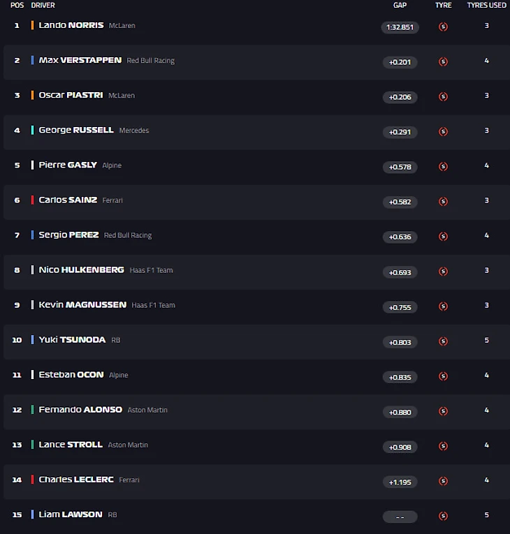 Похоже сработало. Норрис на 0,6 быстрее Пиастри и Расселла и на 0,3 быстрее Сайнса. Ждем Макса.