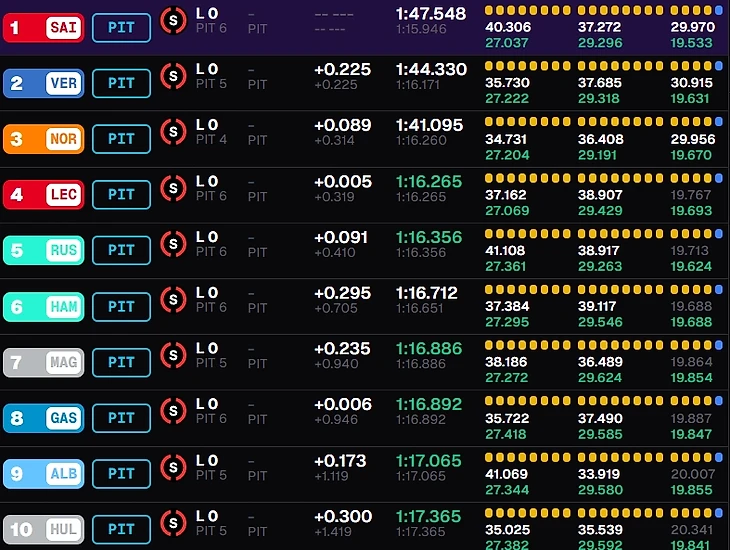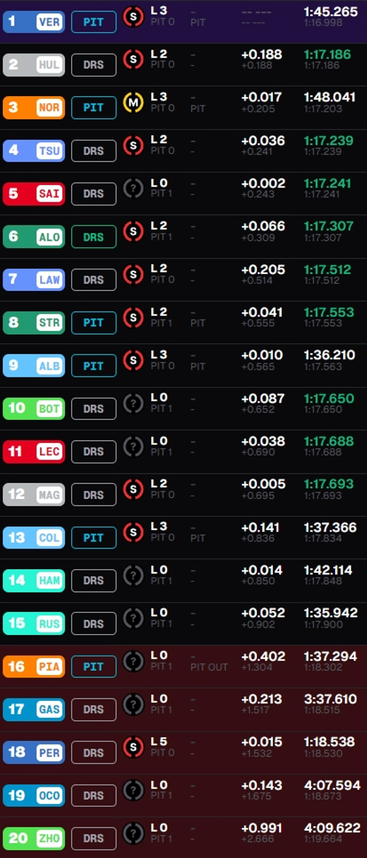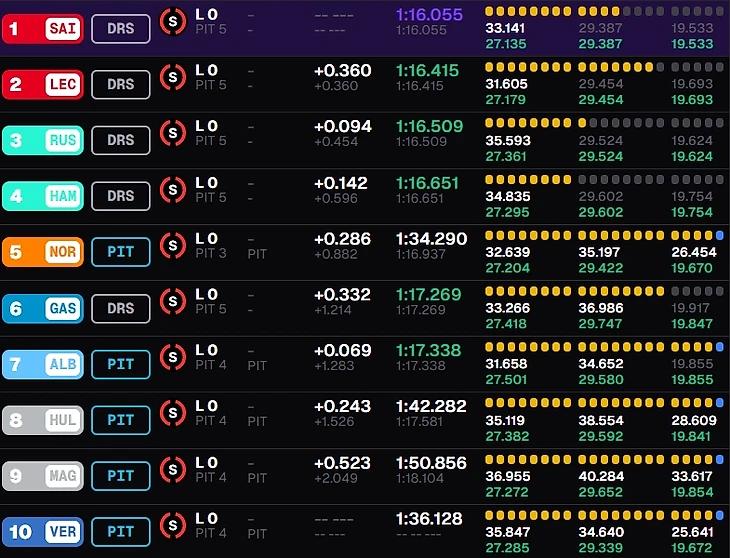 Леклер и Сайнс временно спаслись. 3-4 время, позади Макса и Норриса и впереди двух «Мерседесов».
