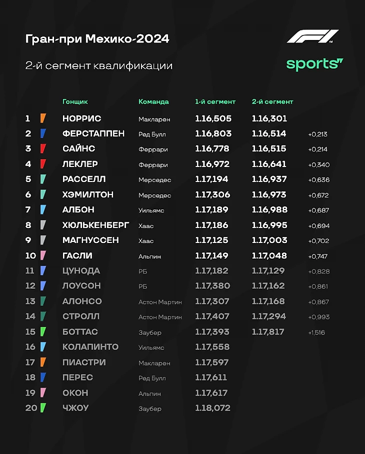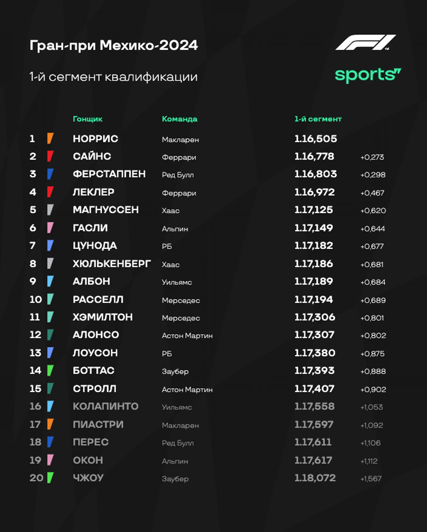 - Есть ощущение, что у «Феррари» сейчас лучшая машина. Леклера чуть занесло в одном из поворотов - и это стоило ему поула, если смотреть на времена на секторах. Тем не менее, у Скудерии нет повород для разочарования. Сайнс на поуле, а Леклер, учитывая особенности старта в Мехико, вполне может закончить первый круг если не лидером, то на втором месте. Настройки у «Феррари» явно на гонку.