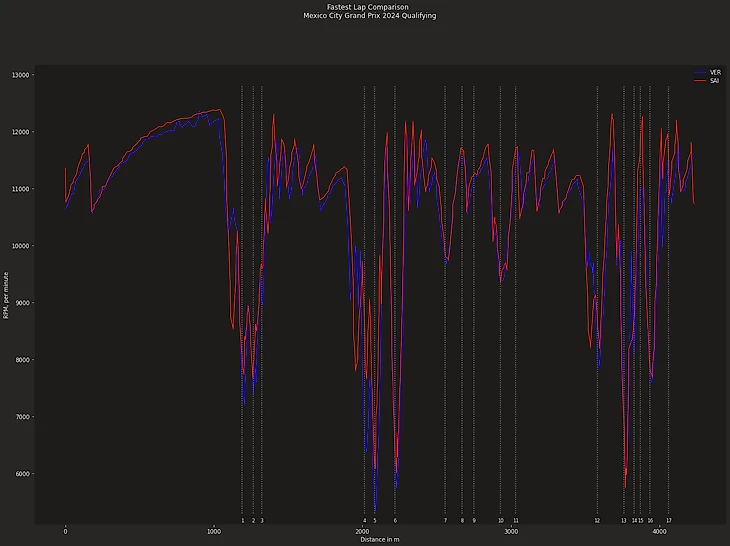По оси у- отложены обороты которые развивал двигатель каждого гонщика, по оси х - отложена дистанция трассы. Вертикальными линиями показаны номера соответствующих поворотов. Красным цветом показан график - Карлоса Сайнца, а синим соответственно Макса Ферстаппена.