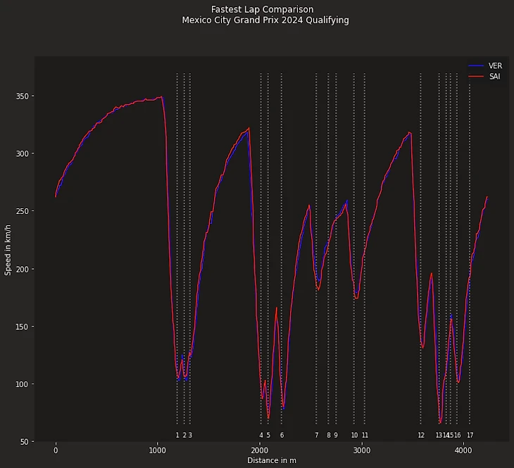 Сравним в квалификации Гран-при Мехико 2024 года круги обладателя поул-позиции Карлоса Сайнца и Макса Ферстаппена.