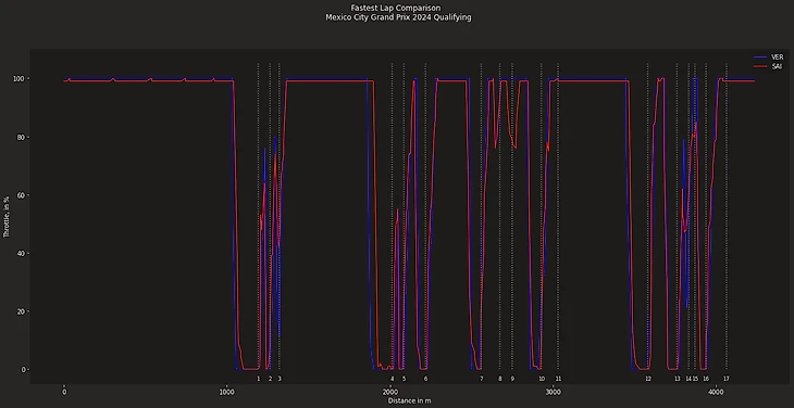 По оси у- степень открытия дроссельная заслонки каждого гонщика (в процентах), по оси х - отложена дистанция трассы. Вертикальными линиями показаны номера соответствующих поворотов. Красным цветом показан график - Карлоса Сайнца, а синим соответственно Макса Ферстаппена.