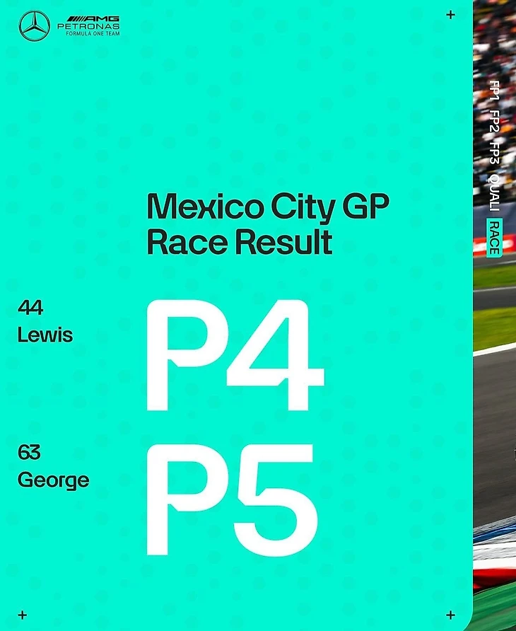 Два Mercedes заняли четвертое и пятое места, продолжая свою борьбу. У Джорджа была не только старая машина, но и старые понтоны, и они дважды менялись местами с Льюисом. Однако в третий раз Льюис всё-таки смог обойти его, используя преимущество более свежей машины и своего опыта. Mercedes, как мы видим, смогли обеспечить себе даже бесплатный пит-стоп за лучший круг. Таким образом, они остались единственными в первой тройке и не вмешались в борьбу за Кубок конструкторов, а позади них также наблюдалась пустота. В этой гонке ситуация была аналогичной.