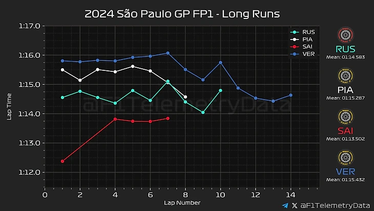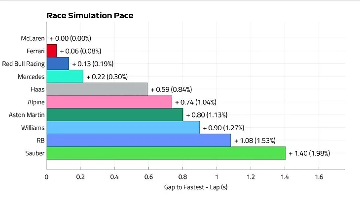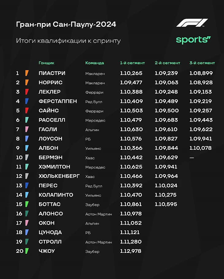 Тем не менее, «Макларен» все равно не выглядел доминирующей силой – даже несмотря на DRS для Норриса, Леклер вполне держался за ними, а Ферстаппен на «Ред Булл» настиг всех троих. Видимо, ограничения настроек из-за кочек и одного комплекта на 28 кругов оказались слишком сильными – атаковать в полную силу не решился никто. В основном заезде развернется совсем другая картина.