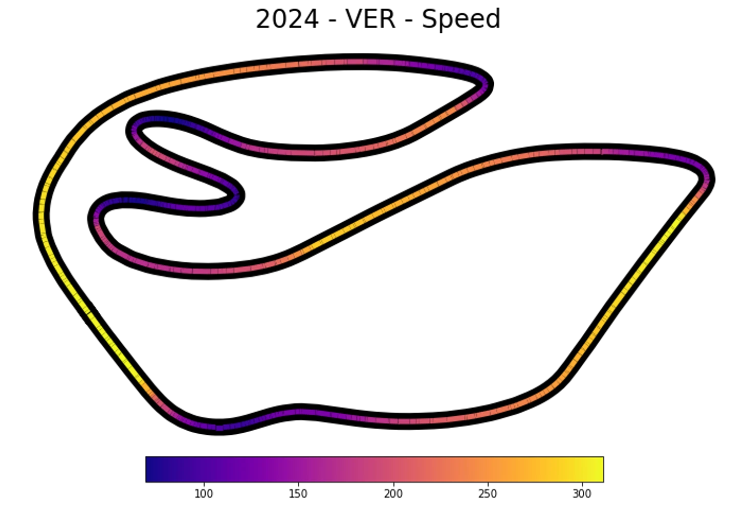 Визуализируем распределение скорости Макса Ферстаппена, установившего быстрейший круг на Гран-при Бразилии, на этом самом круге.