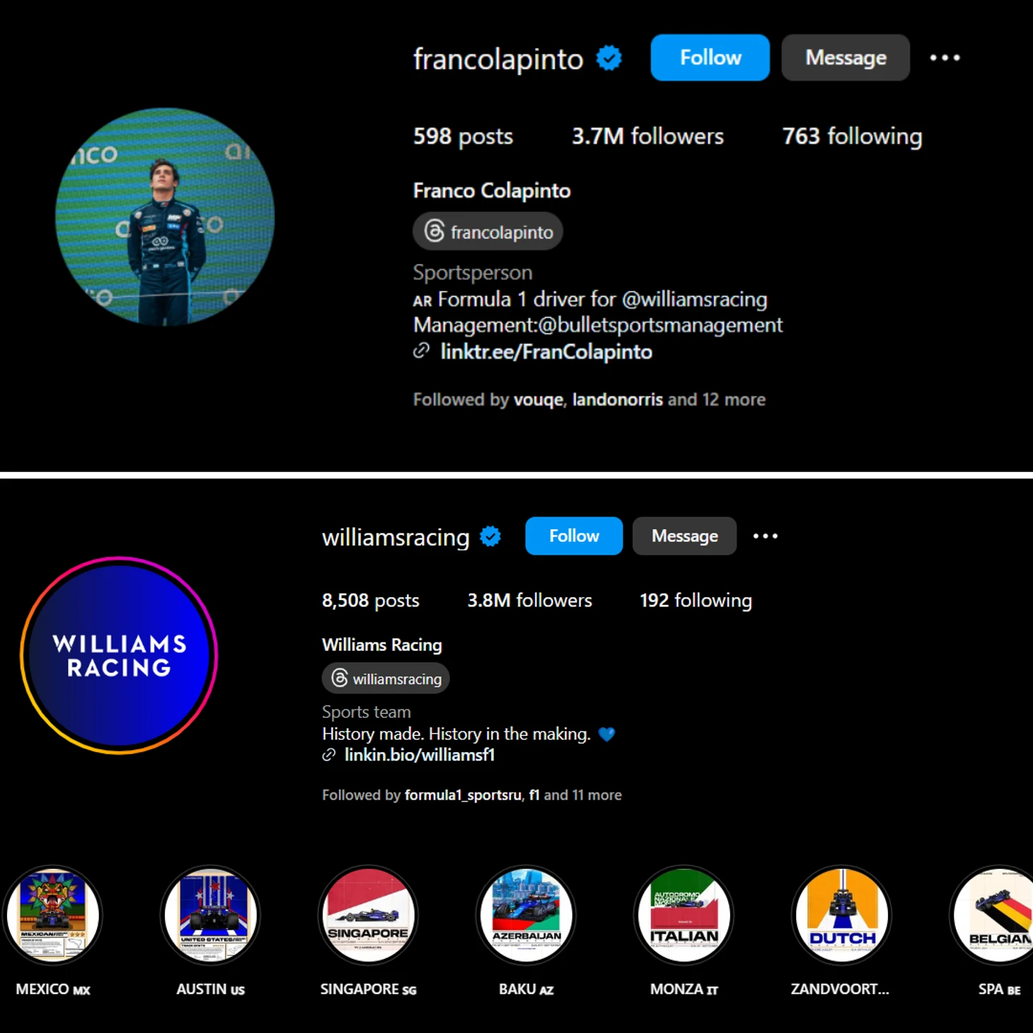 Фото/видео: x.com/F1; x.com/AFASeleccionEN; instagram.com/williamsracing; x.com/SkySportsF1; tiktok.com/@verydirtyair; instagram.com/francolapinto; x.com/lujan1989_; youtube.com/LoopieRaps; x.com/juannadaya; x.com/Colapinto_news; x.com/labandadesaes; x.com/Celulosa_ARG; x.com/elgraficoweb; x.com/SC_ESPN; x.com/F1; youtube.com/@WilliamsF1TV