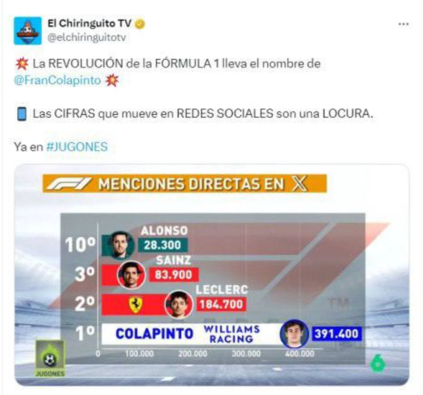 И стал самым упоминаемым пилотом «Формулы-1» в социальных сетях на испанском – бьет всех других звезд. И вообще всех звезд.
