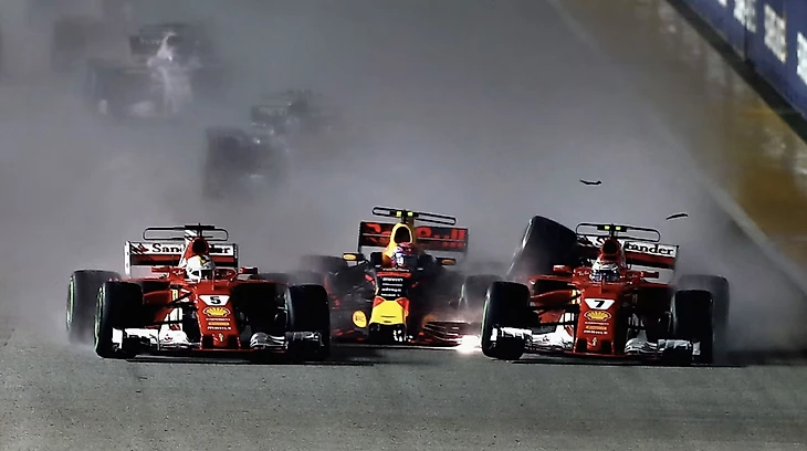 Но накал борьбы спал почти сразу, когда обладатель поула Феттель, Макс Ферстаппен из «Ред Булл» и Кими Райкконен за рулем другой «Феррари» столкнулись на пути к первому повороту, что привело к сходу всех троих.