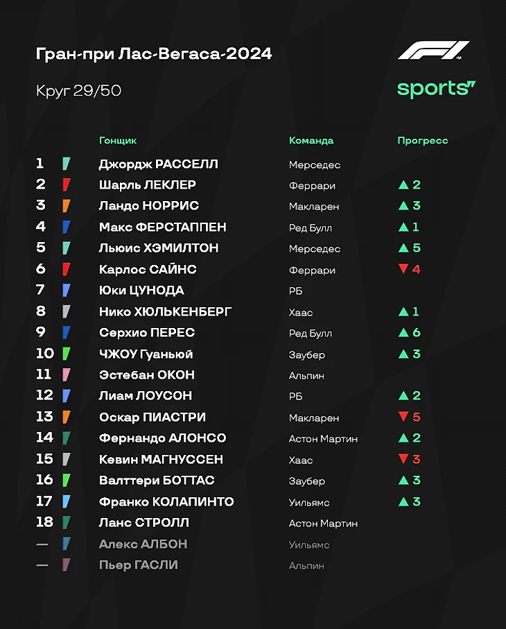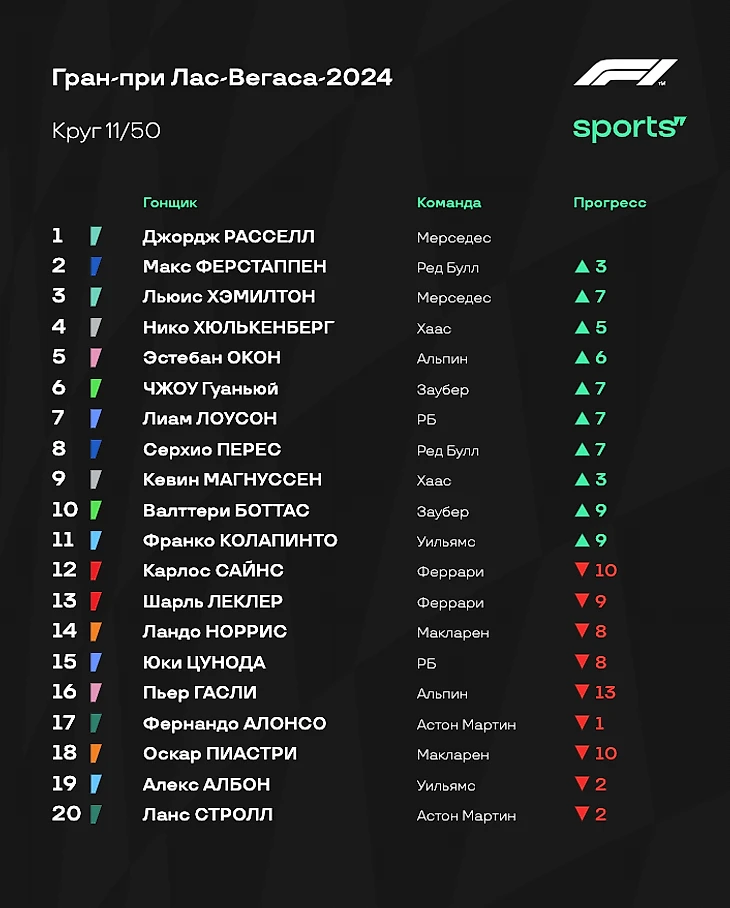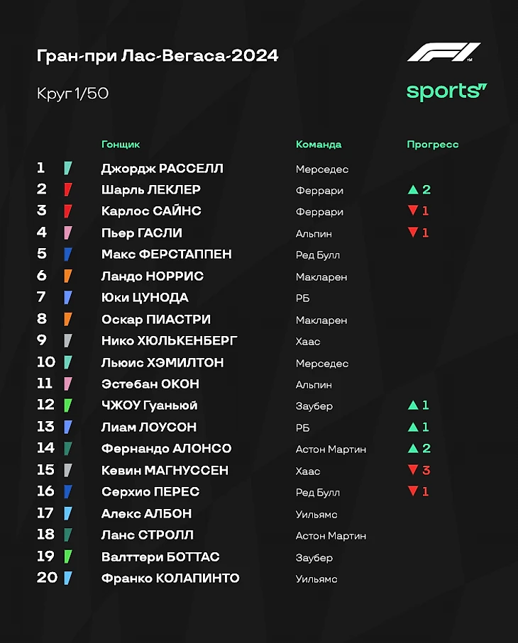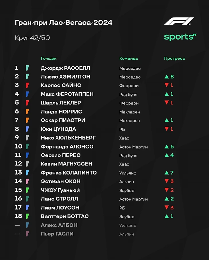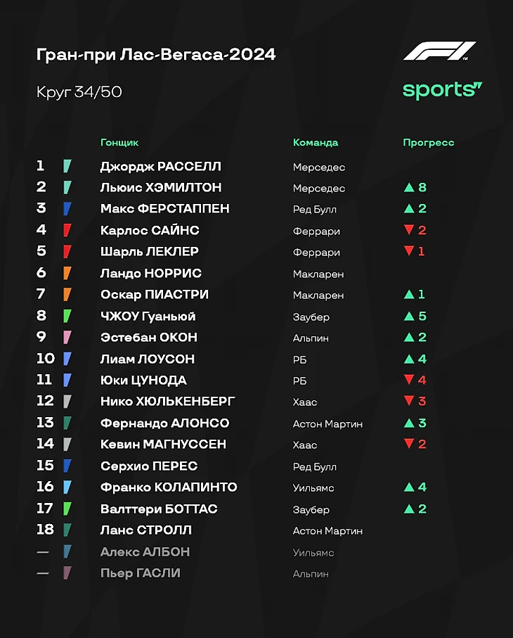 - Ферстаппен выиграл чемпионат - в четвертый раз в карьере! Гонку в Вегасе он провел образцово. Да, Макс финишировал там же, где стартовал, но главное - он сделал все, чтобы не потерять время и выполнить основную задачу на гонку. Он справился. - «Мерседес» был неудержим. Расселл сегодня доминировал и был безумно рад победе: настолько, что его реакция на первое место была ярче реакции Макса на титул. Холодные условия сыграли на руку «серебряным», и они извлекли максимум из ситуации: настолько, что Льюис Хэмилтон смог прорваться с конца первой десятки на второе место. - «Феррари» действовала странно. Ситуация с пит-стопом Сайнса и не лучшее время для размена позиций (под атаками Хэмилтона) - тому доказательства. Сегодня Скудерия финишировала ровно позади «Мерседеса» за счет проблем конкурентов в лице «Ред Булл» и «Макларена». Но если бы не ошибки при работе с резиной и стратегией, «Феррари», возможно, могла добиться большего. - Невзрачный Гран-при для «Макларена». Как и отмечал руководитель коллектива Андреа Стелла, в холодных условиях болид просто не работал. Фактически Норрис и Пиастри проводили свою собственную гонку, словно отдельно от остального пелотона. В Катаре должно сложиться получше. - Под конец стоит отметить результат «Хааса». За счет выхода Хюлькенберга на восьмое место и схода Гасли команде удалось вернуться на шестое место в Кубке Конструкторов. Цунода пытался что-то сделать - но не вышло. Что ж, борьба за титул в личном зачете окончена. Зато в командном все продолжается: «Феррари» приблизилась к «Макларену», и впереди еще две гонки. Следующий Гран-при состоится в Катаре с 29 ноября по 1 декабря. Следите за ходом событий вместе с нами!