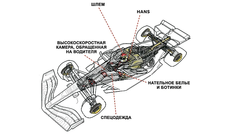 ФИА регулирует конструкцию. Подача медицинского воздуха обязательна, шарф из номекса – по желанию