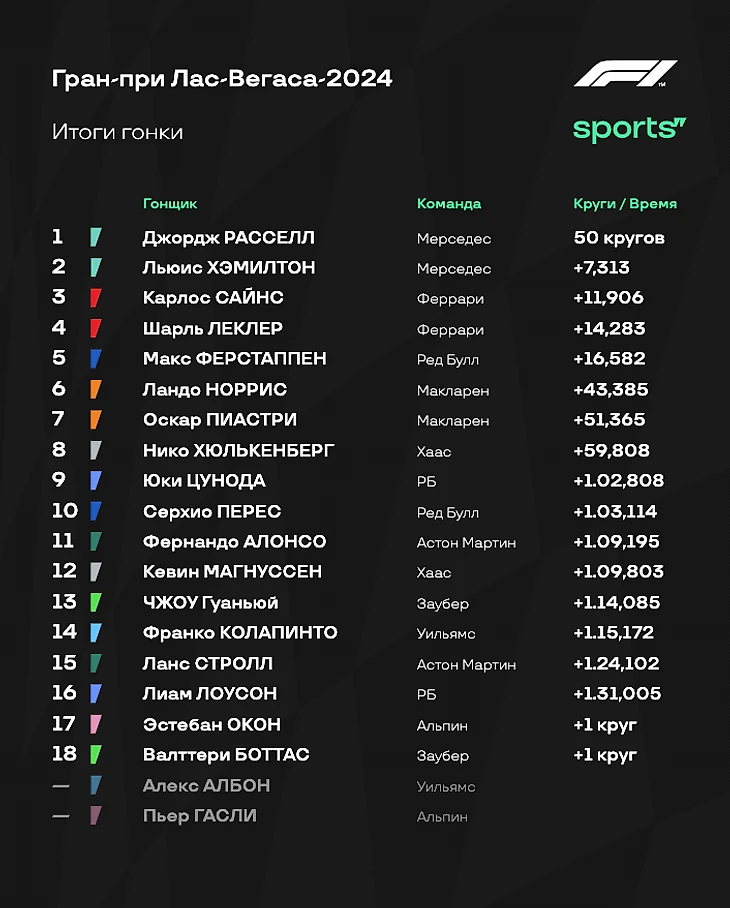 • Расселл удержался первым, Хэмилтон помог «Мерседесу» сделать дубль, Сайнс финишировал на подиуме! Норрис заработал дополнительное зачетное очко за лучший круг гонки.