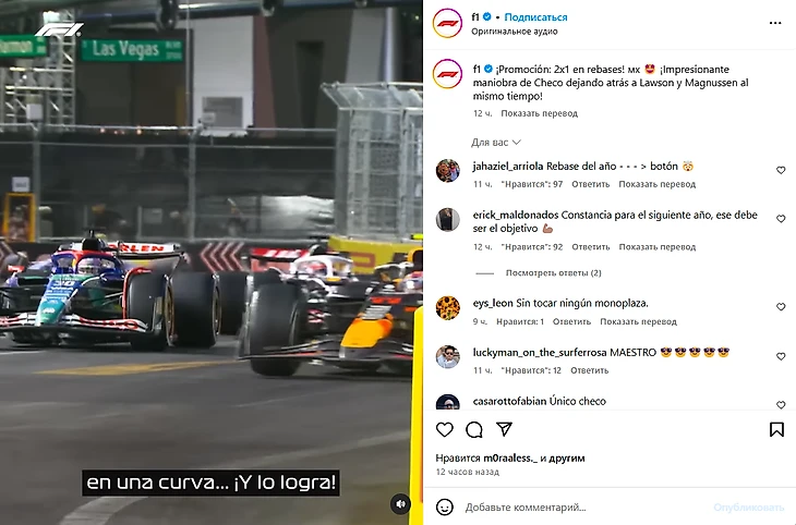 Как это выглядит? После заметного бума «Ф-1» в Испании и на испаноязычных рынках «Ф-1» начала делать и таргетить посты в соцсетях специально на испанском – повторяя и транскрибируя слова на английском. Но теперь у них есть лица: