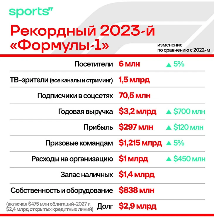 Вообще-то даже в прошлом году было заметно, что связи между доминированием Ферстаппена и успехом гонок среди мировой публики нет! Пусть Макс и обновил рекорд по победам (19 в 22 гонках), 2023-й оказался наиболее успешным в истории и по выручке, и по прибыли, и по аудитории, и по посещаемости Гран-при: серия заработала 3,2 млрд долларов и зафиксировала прибыль в 297 млн – прибавка составила 700 млн дохода по сравнению с 2022-м и 120 млн чистой прибыли.