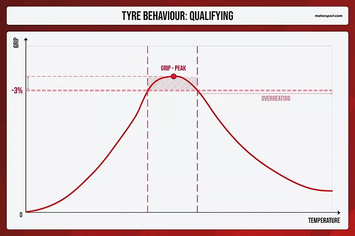 Нюансы объяснил глава гоночного подразделения поставщика «Пирелли» Марио Изола – показал изданию Autosport график поведения резины в квалификации с температурными окнами и пиком сцепления в зависимости от прогрева: