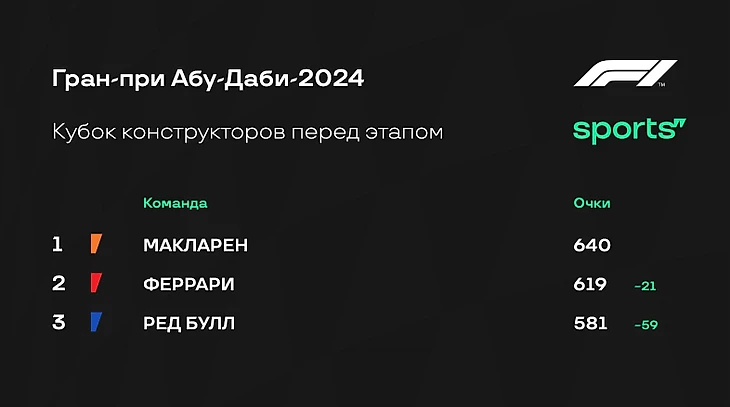 По ходу заезда «Макларен» был близок к тому, чтобы оформить командный титул, но в итоге борьба лишь обострилась. «Феррари» сократила отставание до 21 очка, Кубок конструкторов разыграют в Абу-Даби. «Ред Булл» сохраняет призрачные шансы на вторую строчку.