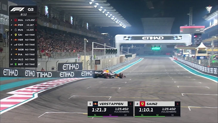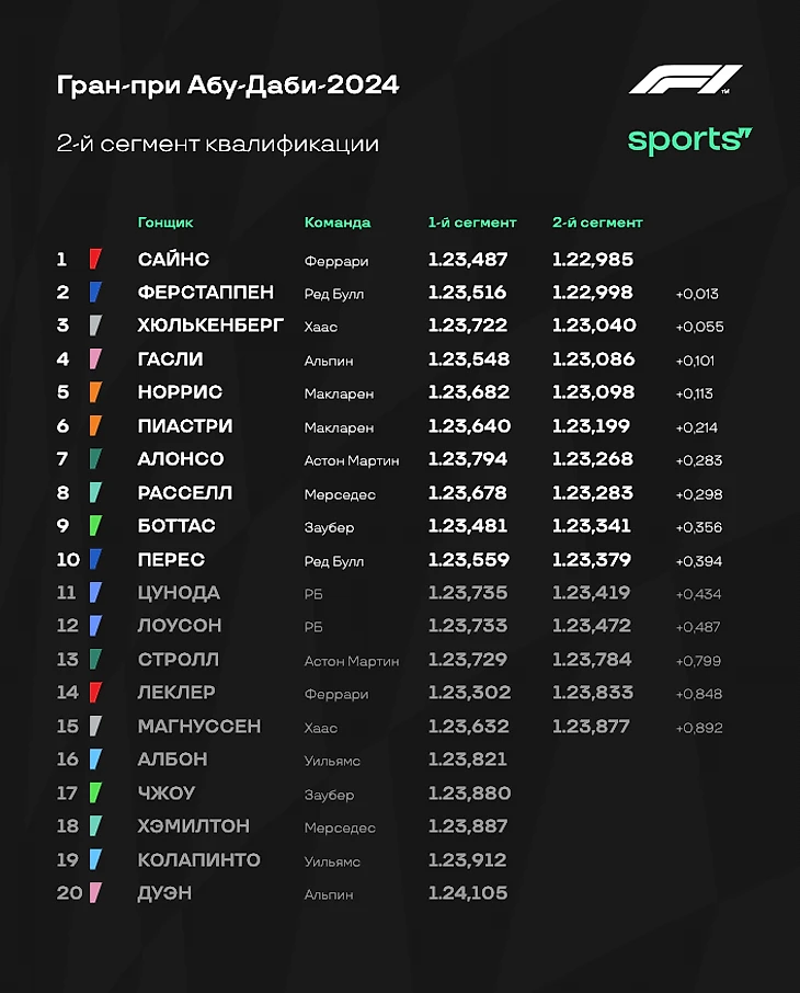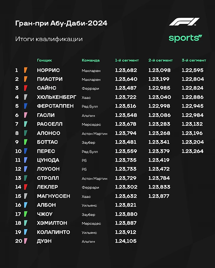 Так. Лучшее время у Макса, Норрис уступил ему 0,004 секунды, Сайнс - третий. Пиастри было показал третье время, но его круг аннулировали - тоже за нарушение границ трассы.