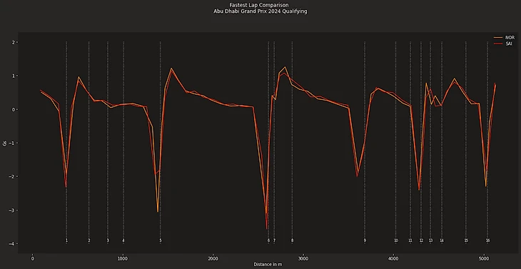 По оси у показана перегрузка (в продольном направлении), которую испытывал (в g), каждый гонщик, по оси х - отложена дистанция трассы. Вертикальными линиями показаны номера соответствующих поворотов. Красным цветом показан график - Карлоса Сайнца, а ранжевым соответственно Ландо Норриса.