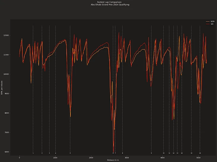 По оси у- отложены обороты которые развивал двигатель каждого гонщика, по оси х - отложена дистанция трассы. Вертикальными линиями показаны номера соответствующих поворотов. Красным цветом показан график - Карлоса Сайнца, а оранжевым соответственно Ландо Норриса.