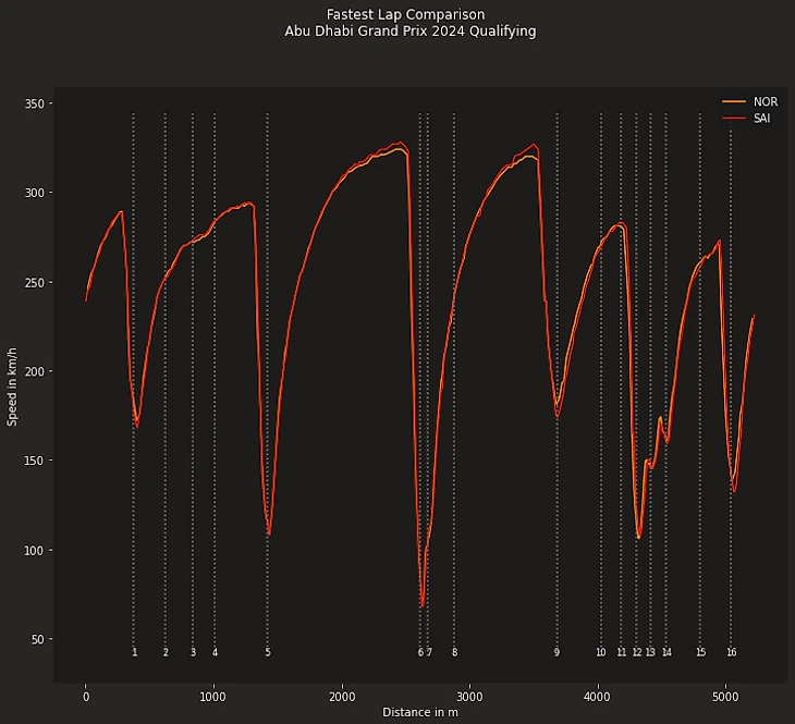 По оси у- отложена скорость каждого гонщика, по оси х - отложена дистанция трассы. Вертикальными линиями показаны номера соответствующих поворотов. Красным цветом показан график скорости - Карлоса Сайнца, а оранжевым соответственно Ландо Норриса.
