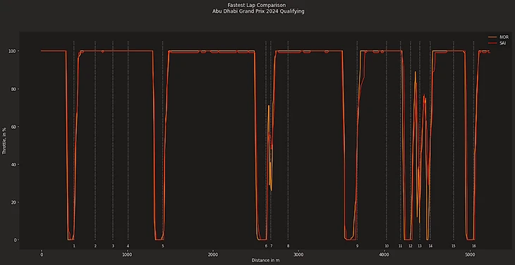 По оси у- степень открытия дроссельная заслонки каждого гонщика (в процентах), по оси х - отложена дистанция трассы. Вертикальными линиями показаны номера соответствующих поворотов. Красным цветом показан график - Карлоса Сайнца, а оранжевым соответственно Ландо Норриса.
