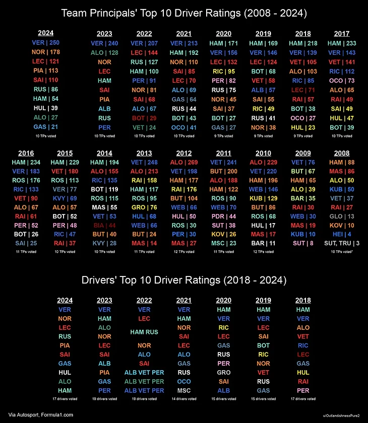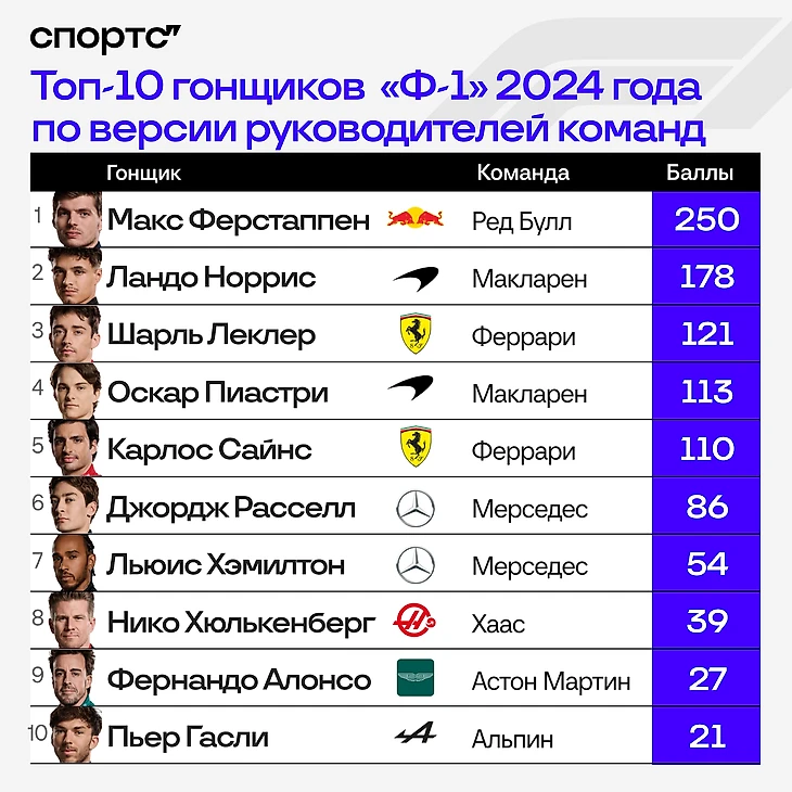 У пилотов вышло интереснее: проголосовали не все, а только 17 гонщиков – все, кто выступал в 2024 году, кроме Ферстаппена, Хэмилтона, Переса, Даниэля Риккардо, Джека Дуэна, Оливера Бермэна и Логана Сарджента. Логана и Дэна даже не было на финальных гонках, Оливер проехал всего 3 этапа, Джек – и вовсе один, Хэмилтон и Ферстаппен никогда не участвовали, а Перес уехал из паддока после финала одним из первых. Потому баллы опять не раскрыли – чтобы не искажать сравнения с предыдущими сезонами.