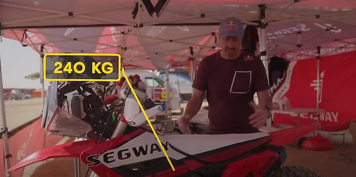 «Это все – техника будущих «Дакаров»! Это байки от китайской фирмы Segway. Полностью электрический. Он очень тяжелый – 240 кг – из-за масштабного обвеса из батарей, потому на подвеске установлены двойные амортизаторы.