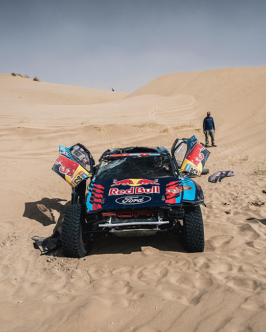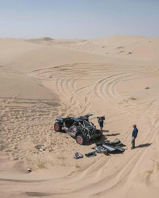 Каркас безопасности спас пилотов и выдержал жесткий удар после ската по дюне, но погнулся – и ФИА не допустила экипаж к продолжению рейда после первого марафонского спецучастка. Зато какие фантастические кадры остались!