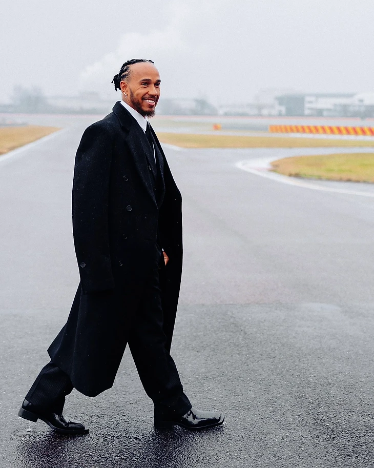 На базу Льюис прибыл торжественно и необычно: классический костюм с галстуком и модное пальто – как будто на прием на высшем уровне (вроде получения рыцарства или нового кубка от ФИА).