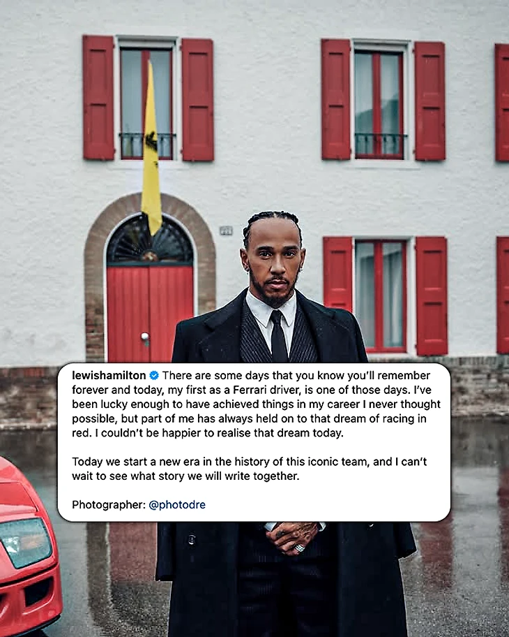 Вообще, недавно обновленный симулятор «Феррари» намного продвинутее оборудования «Мерседеса» (есть даже теория, что именно он стал одной из причин трансфера). Потому Льюис еще и отработал интенсивную сессию на виртуальной версии прошлогоднего SF-24 в конфигурации конца сезона – чтобы «стереть» из памяти все свойства и поведение болидов «Мерседеса». А вечером 21 января выпустил первую фотку в новой униформе.