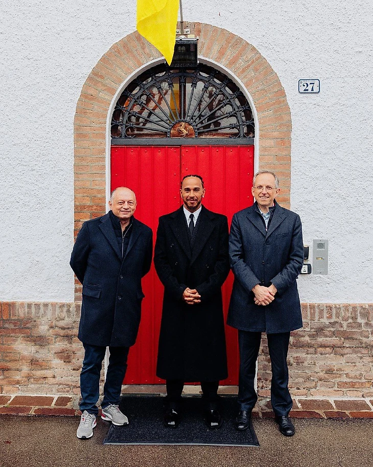 Оттуда Льюис отправился на трассу Фьорано, где на фоне дома Энцо Феррари, на небольшой площади, его встретили Фредерик Вассёр (руководитель команды Феррари, ранее работавший с Льюисом в ART) и генеральный директор Скудерии Бенедетто Винье. Там были сделаны первые фото британца в качестве пилота итальянской команды, на фоне красного дома Энцо и спорткара Феррари F40 (любимой машины Хэмилтона). Льюис выложил эту фотографию к себе в Instagram и она за неполные сутки побила рекорд по количеству лайков для публикаций связанных с тематикой Формулы-1, обогнав пост Шарля Леклера с толпой болельщиков после победы в Монце-24