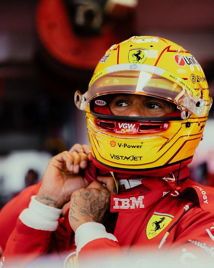 Так же с утра Хэмилтон презентовал свой новый шлем. Он уже привычно жёлтый, но вместо прошлогодних синих вставок - насыщенно красные (поговаривают, что такой же красный будет и на ливреи Скудерии).