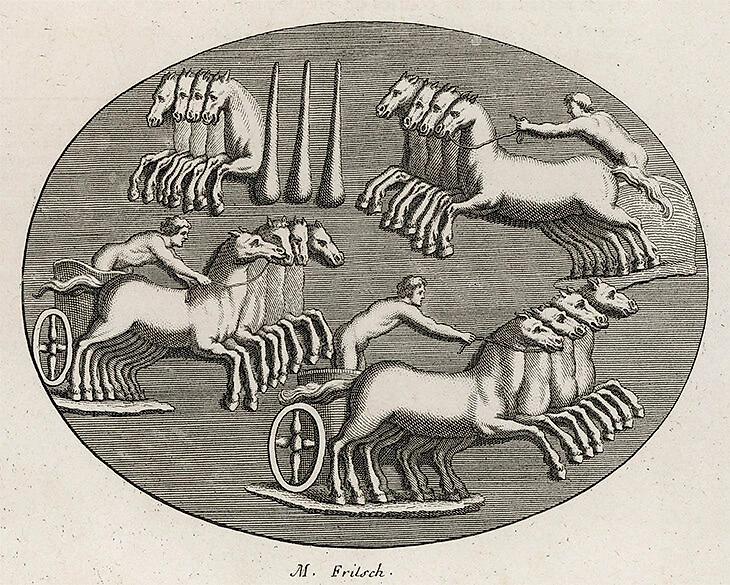 В Древней Греции гонки на повозках стали важной частью античных Олимпиад. Первые Игры датированы 776 годом до н.э., а первое задокументированное олимпийское соревнование колесниц датировано 680-м. Состязались квадриги, то есть четверки лошадей (позже добавили двойки), которым нужно было пройти несколько кругов по овальному ипподрому. Его длина – 720 метров, ширина – 320. Разделительного барьера в центре не было, что делало гонки очень опасными. К тому же правила не запрещали мешать соперникам, подрезать и выталкивать с дистанции.