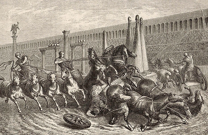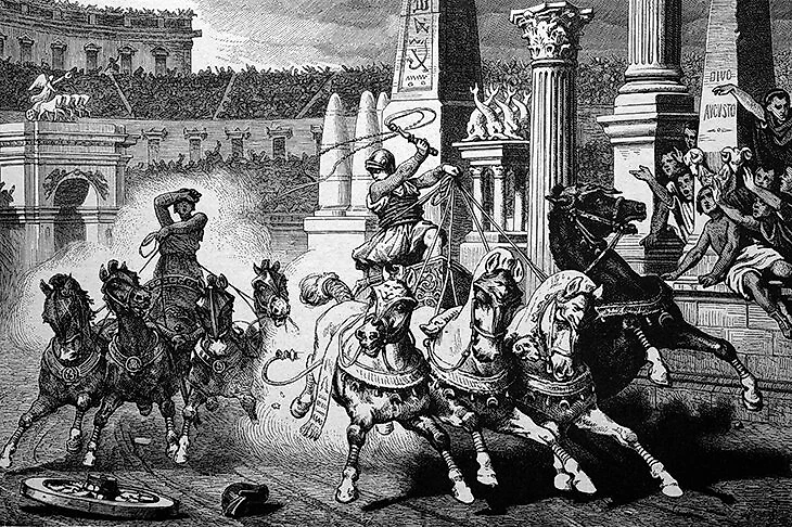Знаменитое выражение «хлеба и зрелищ» вопреки распространенному мнению – как раз про гонки колесниц, но в оригинале звучало иначе – Panem et circenses («Хлеба и цирка»). Гонки стали самым народным видом спорта в Риме, опережая в том числе и гладиаторские бои.