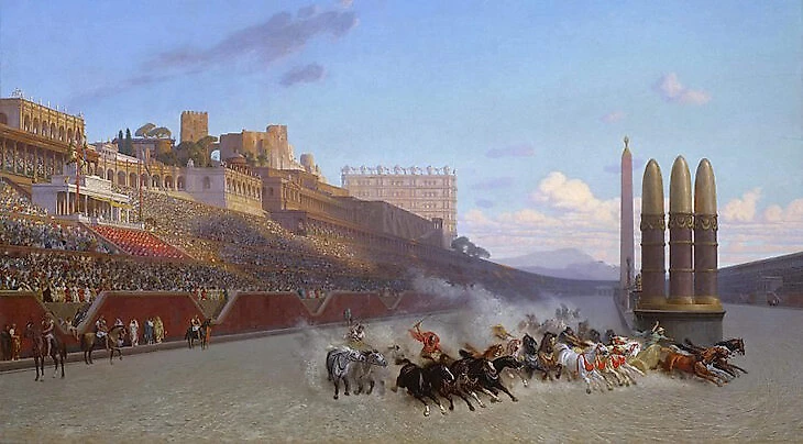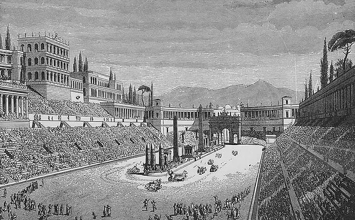 В Риме главные гонки проходили в «Большом цирке». Возможно, его трибуны вмещали 385 тысяч зрителей