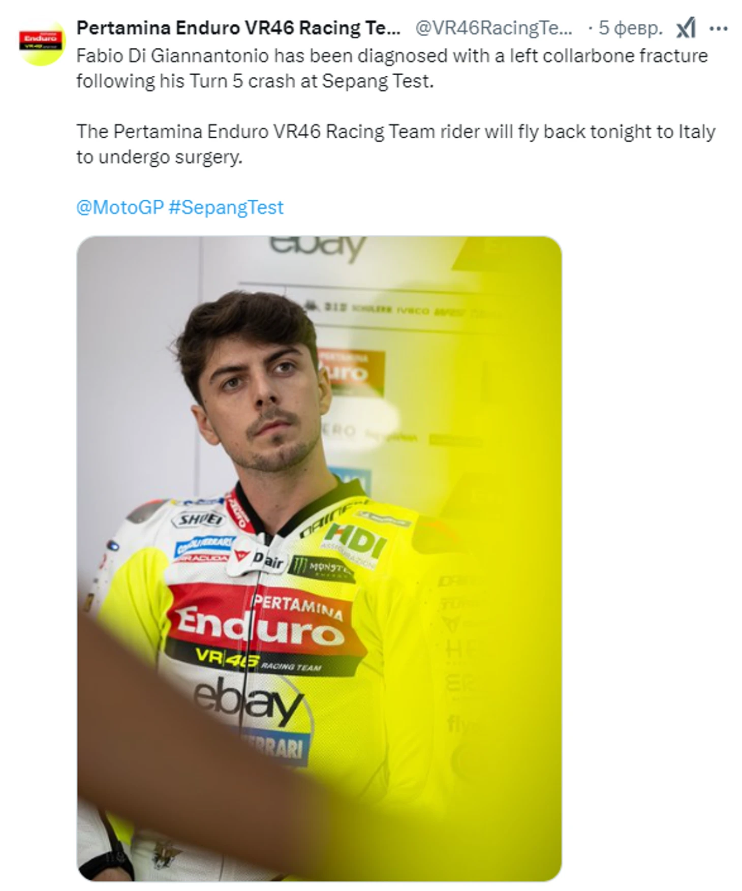 Первый день предсезонных тестов MotoGP в Сепанге выбил из строя сразу трех гонщиков – действующего чемпиона Хорхе Мартина («Априлия»), Рауля Фернандеса («Трэкхаус Рейсинг») и Фабио ди Джанантонио («ВР46»). Последний получил серьезную травму уже после окончания сессии. Падение оказалось настолько неожиданным, что не попало в трансляцию – в этот момент международный эфир переключился на студийных аналитиков.