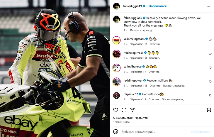 «Фабио был счастлив – три месяца без байка позади. Вчера отработал фантастически. А когда гонщики в хорошем настроении, они делают вилли. Он сделал это не в том месте – между четвертым и пятым поворотами, под углом… Такое не должно происходить, но я его понимаю, сам был гонщиком. Конечно, ситуация сложная: только восстановился – и снова травма».