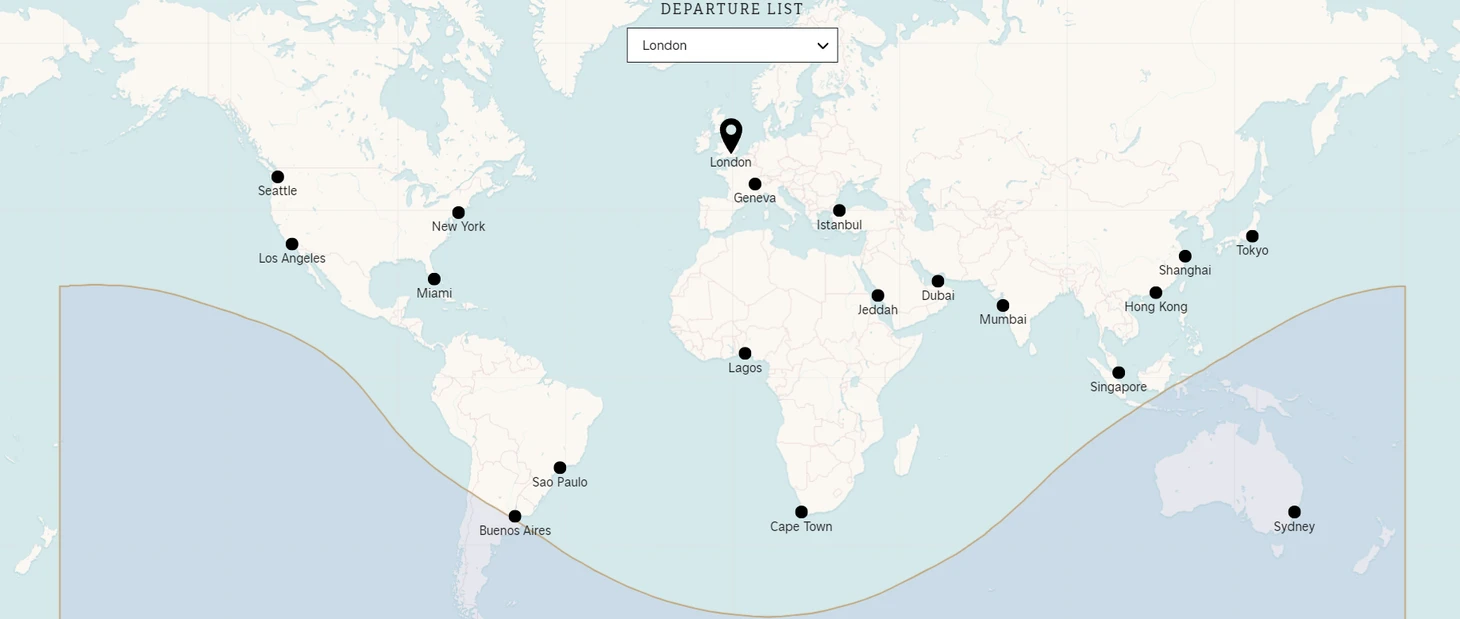 Новый джет способен пролететь около 12 тысяч километров (предыдущий – около 8 тысяч) без «пит-стопа» – например, на карте видно, в какие места самолет долетает на одном баке из Лондона.
