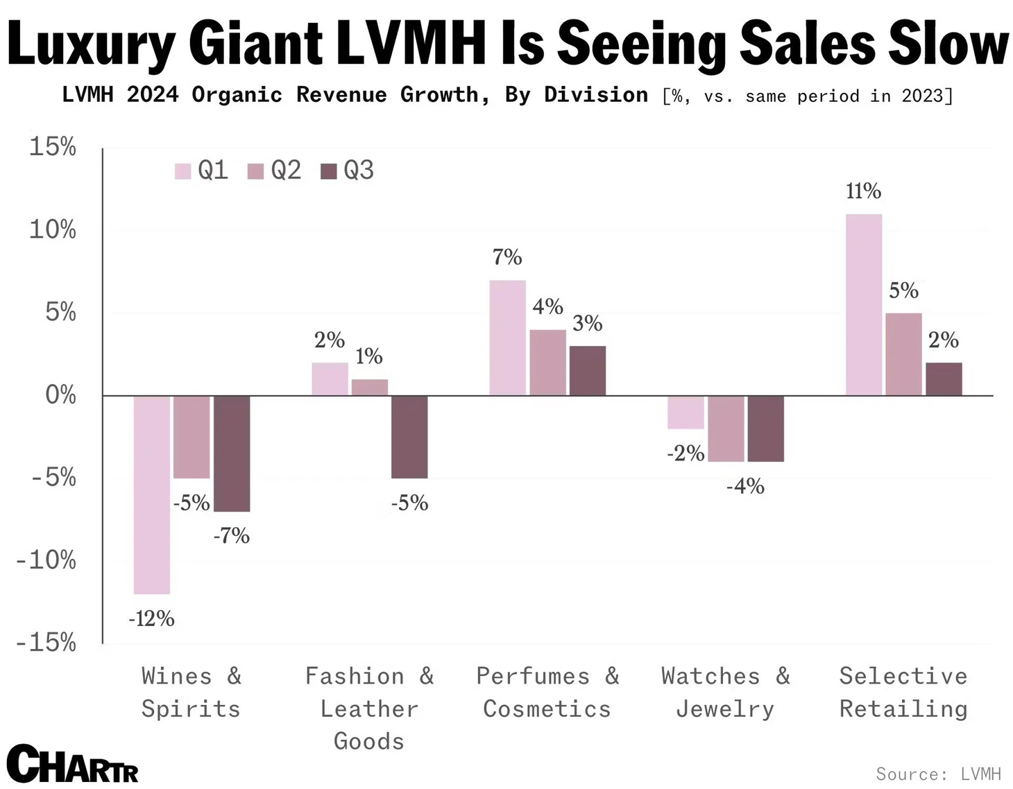 И в конце 2024-го LVMH как раз подписал 10летний контракт с «Ф-1» на €100 млн в год – для продвижения марок как раз в самых снижающихся сегментах. В Гран-при вернули шампанское Moet-Chandon, а основной модный бренд Louis Vuitton выступит официальным поставщиком роскошных кейсов под кубки для подиума (и еще титульным партнером первого этапа – Гран-при Австралии).