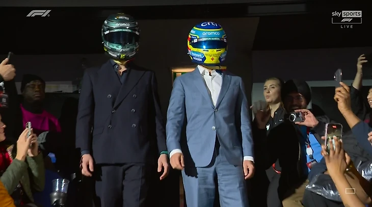 Фернандо Алонсо и Ланса Стролла посадили за руль катеров с примочками от болида «Ф-1», а закончилось все тем, что они вышли к публике в костюмах и шлемами на голове – в роли агентов 0014 и 0018.