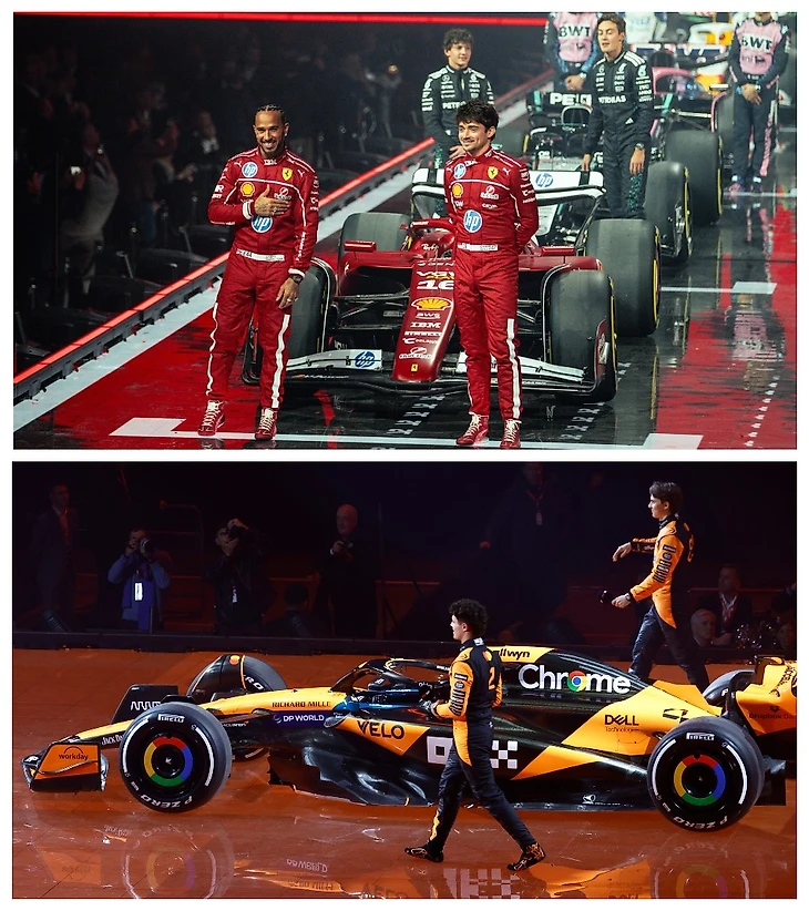 Венчали представление расцветок чемпионы прошлого года из «Макларен». Для разогрева коллектив из Уокинга слепил видео, которое отображало эволюцию команды - оранжевый дебют ракеты-сигареты Брюса Макларена, ставшие знаменитыми бело-красные оттенки эпох Ханта, Лауды, Проста и Сенны. Дальше картинка пронесла сквозь серебряные времена перехода веков к возвращению к классическим тонам в наше время. И когда экран потух, на подиуме одна за другой появлялись эти машины в реальном воплощении. Смотрелось очень круто, ностальгично и лишний раз напомнило, что церемония проходит недалеко от баз команд, что сделало возможным доставку раритетной техники на шоу. Тем временем на сцене вокруг Кубка чемпионов столпились Зак Браун и Андреа Стелла, которые сняли одеяло с новой надежды Пиастри и Норриса - McLaren MCL39, который остался верен оранжево-черной гамме.