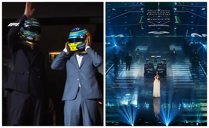 После короткой паузы наступил черед богатых команд вовсю проявить фантазию в выступлении. Тренд запустили «Астон Мартин», которые в дни перед церемонией оформили часть Лондона в фирменных оттенках. Ближайшую к форуму станцию метро «North Greenwich» украсили зеленые полотна, в дополнение внутри установили постеры с портретами пилотов и изображениями машины. Номер Aston Martin на F1 Live начался под мелодию из «Джеймса Бонда», под которую среди зрителей появились два героя в строгих костюмах и гоночных шлемах. Пока пилоты быстро скидывали презентативную чешую на рабочие наряды, внимание зрителей заняла певица Tems, следом за которой ехал утонченный изумрудно-зеленый болид.