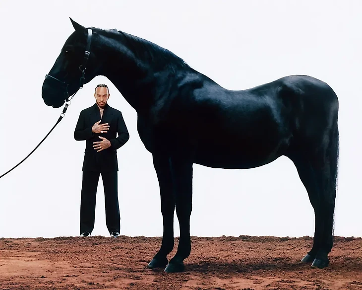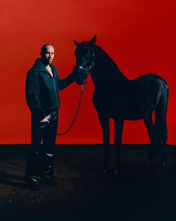 Когда рассказывает про громкий переход из «Мерседеса», где он выиграл шесть из семи титулов, в «Феррари», британец выбрасывает прочь всю осторожность. На фото Льюис рядом с настоящей черной лошадью, имитирующей знаменитый логотип итальянского автопроизводителя.