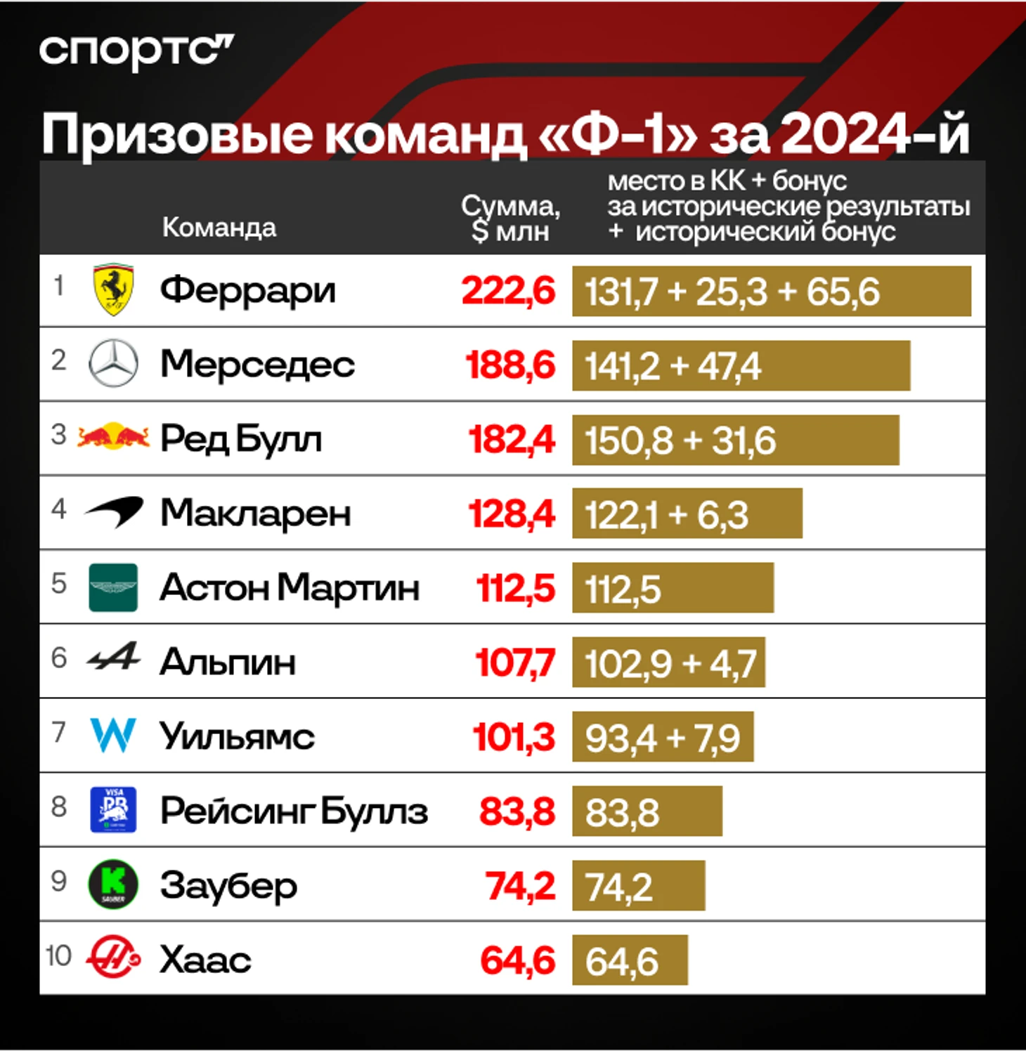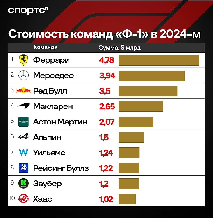 Американское издание Sportico – аналог Forbes для спорта – выпустило оценку команд «Формулы-1» за 2024-й как раз по данным призовых и выручки. По ним эксперты и формировали итоговую приблизительную стоимость гоночной организации как компании – теперь даже для покупки самого беспросветного аутсайдера придется выложить не меньше 1 млрд.